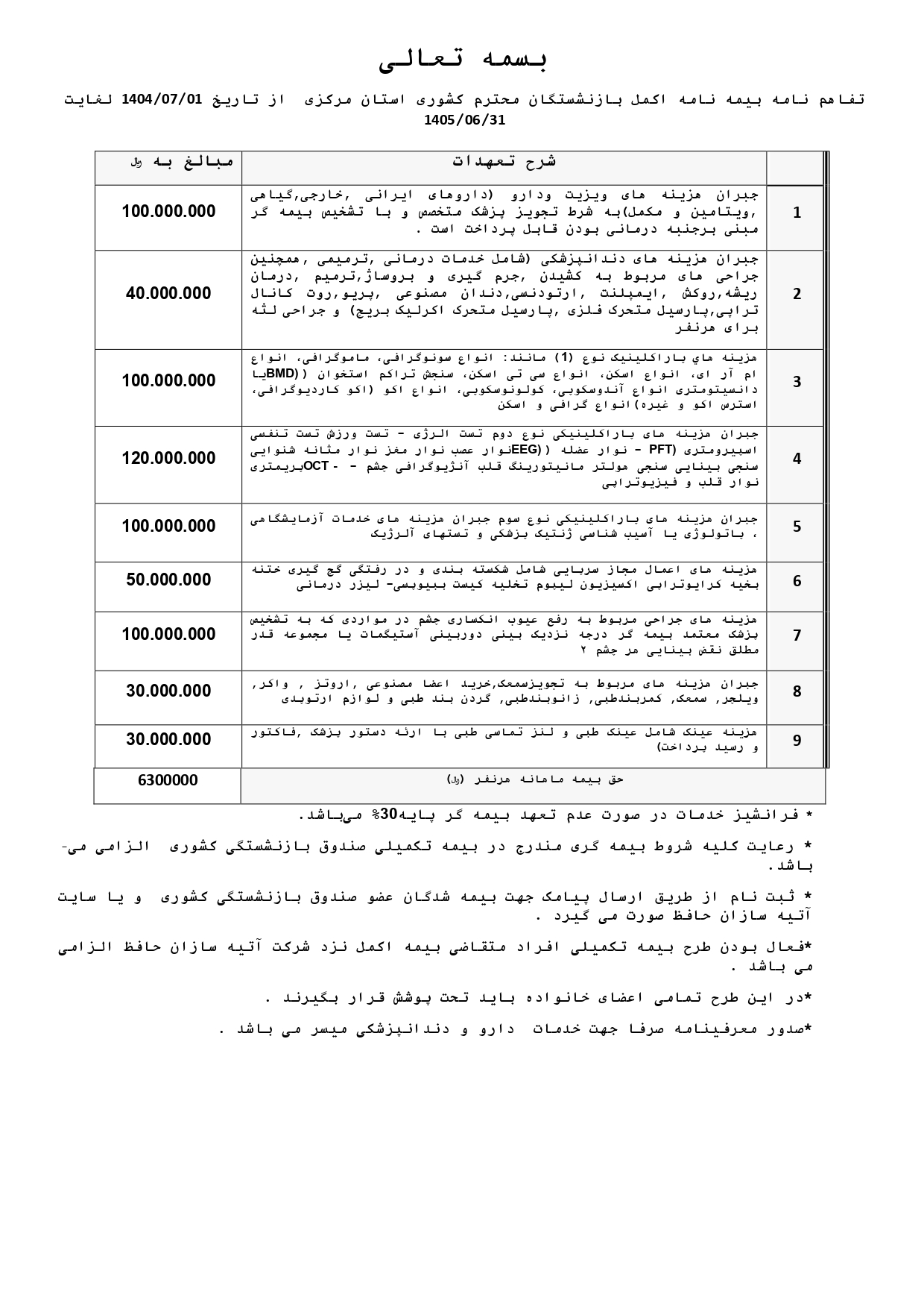 برای اطلاع از تعهدات قرارداد بیمه اکمل استان مرکزی، به قسمت ثبت نام بیمه اکمل سایت آتیه سازان حافظ مراجعه نمایید.
